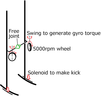 YANBO7 is a passive dynamic locomotion based biped with a free hip pitching joint as in Fig.1. All actuations are basically synchronized to a natural movement of mechanism, which is sensed by touch switch and laser sensing of foot to the floor. By a gyro effect of wheel on each leg, pitching and rolling torque are generated. They are used to excite swing motion of the leg and rolling undulation of whole robot respectively. A relatively small torque of yaw actuation keeps a direction of walking. A kicking force generated by a solenoid on the foot is also used to maintain rolling steps. With these actuation controls, YANBO7 can walk slowly with almost full rolling span and freely without impeding original mechanical movements.
